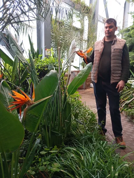 – Это растение – стрелиция, – рассказывает Артур Рязапов. – И правда, цветок напоминает голову птицы. Стрелицию нам подарила жительница города. Представьте, она вырастила её из маленькой семечки. Теперь это три мощных растения. И все три цветут. Специального ухода стрелиция не требует: главное – тепло, влажность, немного подкормок. Аромата нет, она вообще не пахнет – она берет другим: красотой и формой.