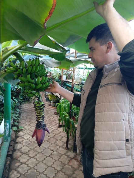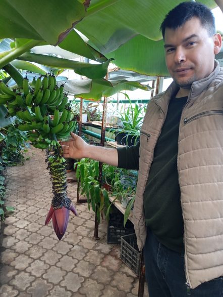 – Сейчас у нас плодоносят королевские бананы, это маленькие серповидные плоды, – говорит руководитель сада Артур РЯЗАПОВ. – Они ароматнее, слаще, плотнее других. И, конечно, если плод полностью вызрел на растении, а не дозревал в дороге – вкус совершенно другой. Он отличается от того, что присущ бананам из магазина.