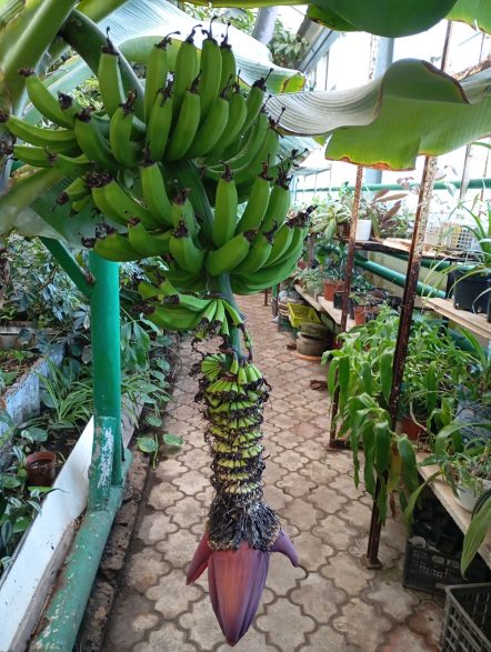 В оранжерее ботанического сада бананы плодоносят не каждый год. 20-25 месяцев – именно столько времени требуется для того, чтобы молодой побег превратился в зрелую кисть. Если цветонос появляется зимой, когда происходят перепады температуры и влажности, женские цветки могут просто не завязаться. Бывает так, что цветонос есть, а плодов нет – тогда, как говорят в саду, «пустой» год. А если стрелка выходит в теплый период, то целая кисть формируется красиво и полно. Пока кисть наливается, старое растение завершает свой жизненный цикл.