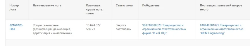 Руководитель управления недропользования, окружающей среды и водных ресурсов Павлодарской области Сагын ТОЛЕУТАЕВ и учредитель и директор ТОО фирма «В и К ЛТД» Багустар АМРИ по результатам конкурса госзакупок подписали договор на 15 650 720 000 тенге на травлю комаров. Вторым участником конкурса было ТОО «QSM ENGINEERING», по странному совпадению имеющее те же контакты, что и «В и К ЛТД».