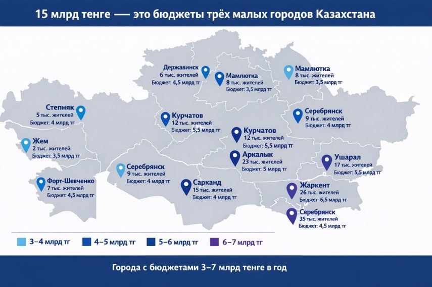 Кроме того, 15 млрд тенге – это бюджет небольшого города вроде Текели, Каратау или Курчатова. Около двух десятков городов в Казахстане с населением 10-30 тысяч человек вроде Степняка, Форт-Шевченко или Серебрянска живут на пять миллиардов.
