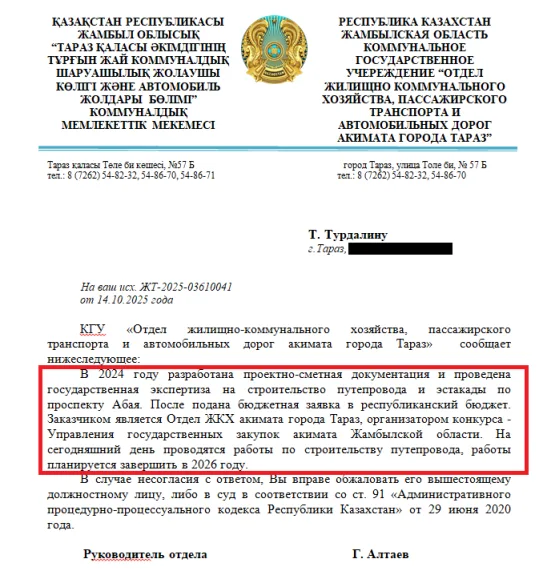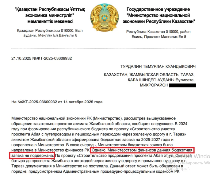 – В 2024 году при формировании республиканского бюджета по проекту «Строительство участка проспекта Абая с путепроводом и пешеходным переходом через железную дорогу в г. Тараз» акиматом Жамбылской области сформирована бюджетная заявка на 2025–2027 годы и направлена в Министерство. В свою очередь, Министерством бюджетная заявка была направлена в Министерство финансов РК. Однако Министерством финансов данная бюджетная заявка не поддержана, – сообщил нам вице-министр.