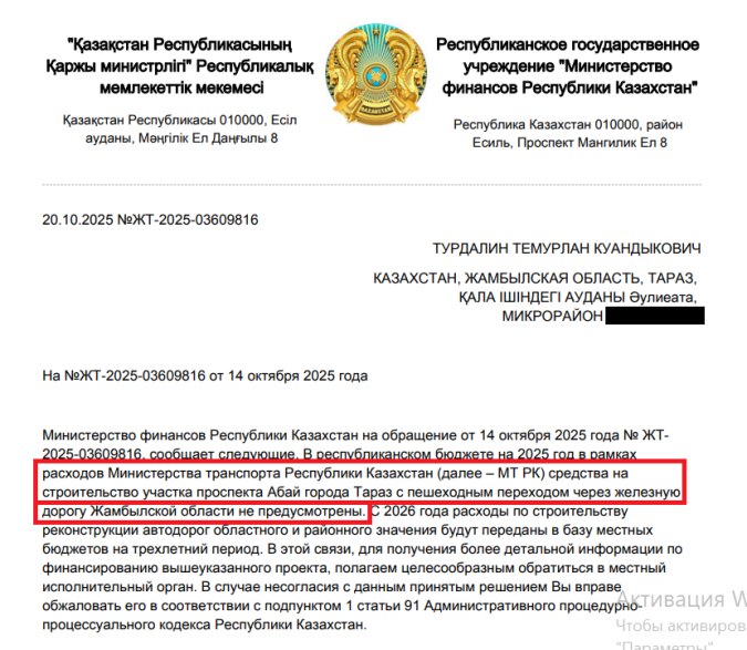 – В республиканском бюджете на 2025 год в рамках расходов Министерства транспорта Республики Казахстан средства на строительство участка проспекта Абая города Тараз с пешеходным переходом через железную дорогу в Жамбылской области не предусмотрены. С 2026 года расходы по строительству и реконструкции автодорог областного и районного значения будут переданы в базу местных бюджетов на трёхлетний период, – сообщила в своём ответе на наш запрос замдиректора департамента Минфина Фатима Жумалиева.
