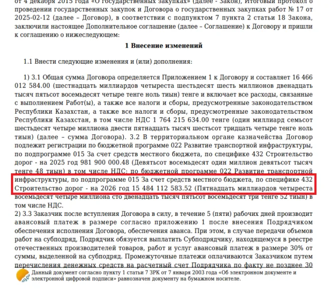 – В территориальном органе казначейства договор подлежит регистрации по бюджетной программе 022 «Развитие транспортной инфраструктуры», по подпрограмме 015 «За счёт средств местного бюджета», по специфике 432 «Строительство дорог»: на 2025 год – 981 900 000 тенге, на 2026 год – 15 484 112 583 тенге, – говорится в допсоглашении.