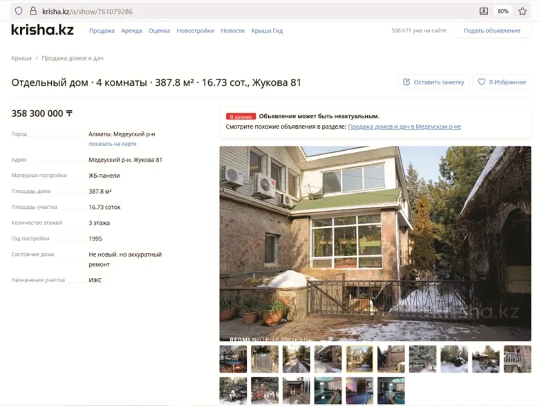 Просто Hronika.kz обнаружила в архиве сайта Крыша.кз объявление, которое давали в январе 2025 года о продаже именно этого земельного участка с постройками. Описание объекта в объявлении точь-в-точь соответствует описанию в решении суда. Только есть один нюанс – дом продавался за 358 300 000 тенге, а на фото объекта есть ватермарка «Народный банк, 29.01.2025».
